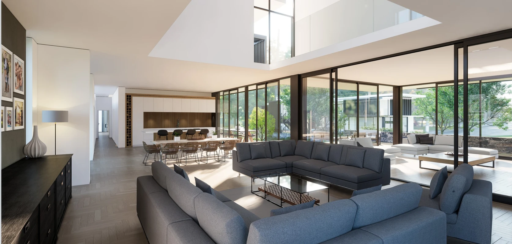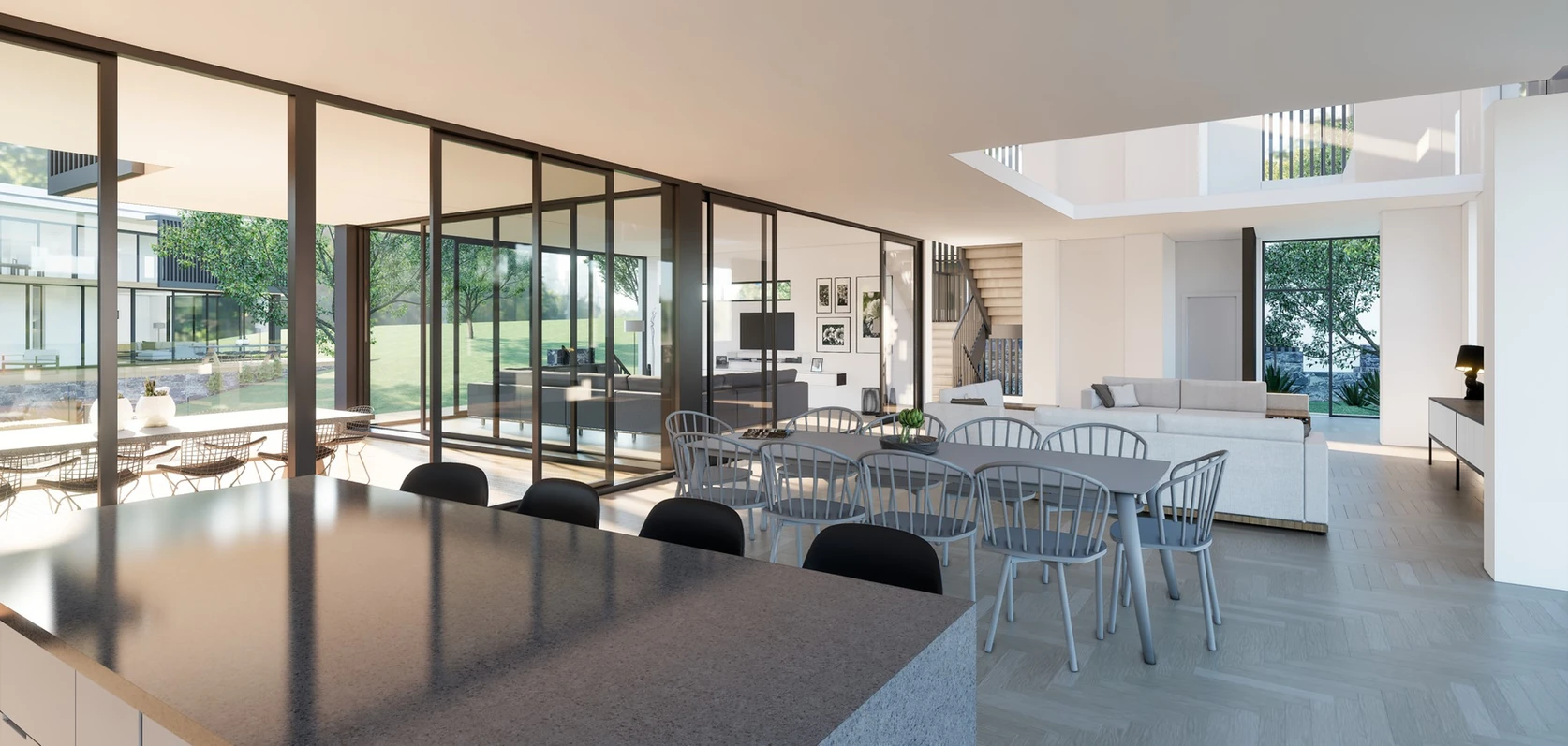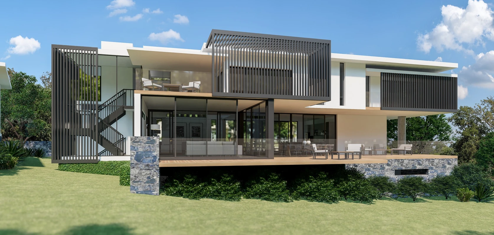 Design a family estate that balances independence and togetherness, with each family unit enjoying its own private home while sharing the larger property. Create spaces that celebrate family life, where multiple generations can live harmoniously while making the most of the stunning natural surroundings.