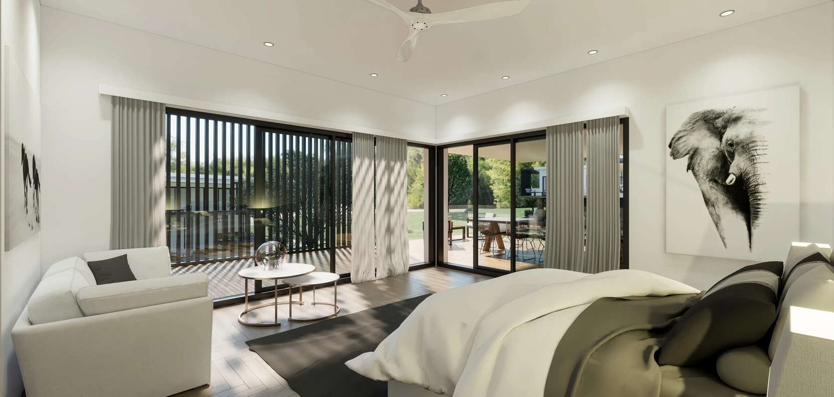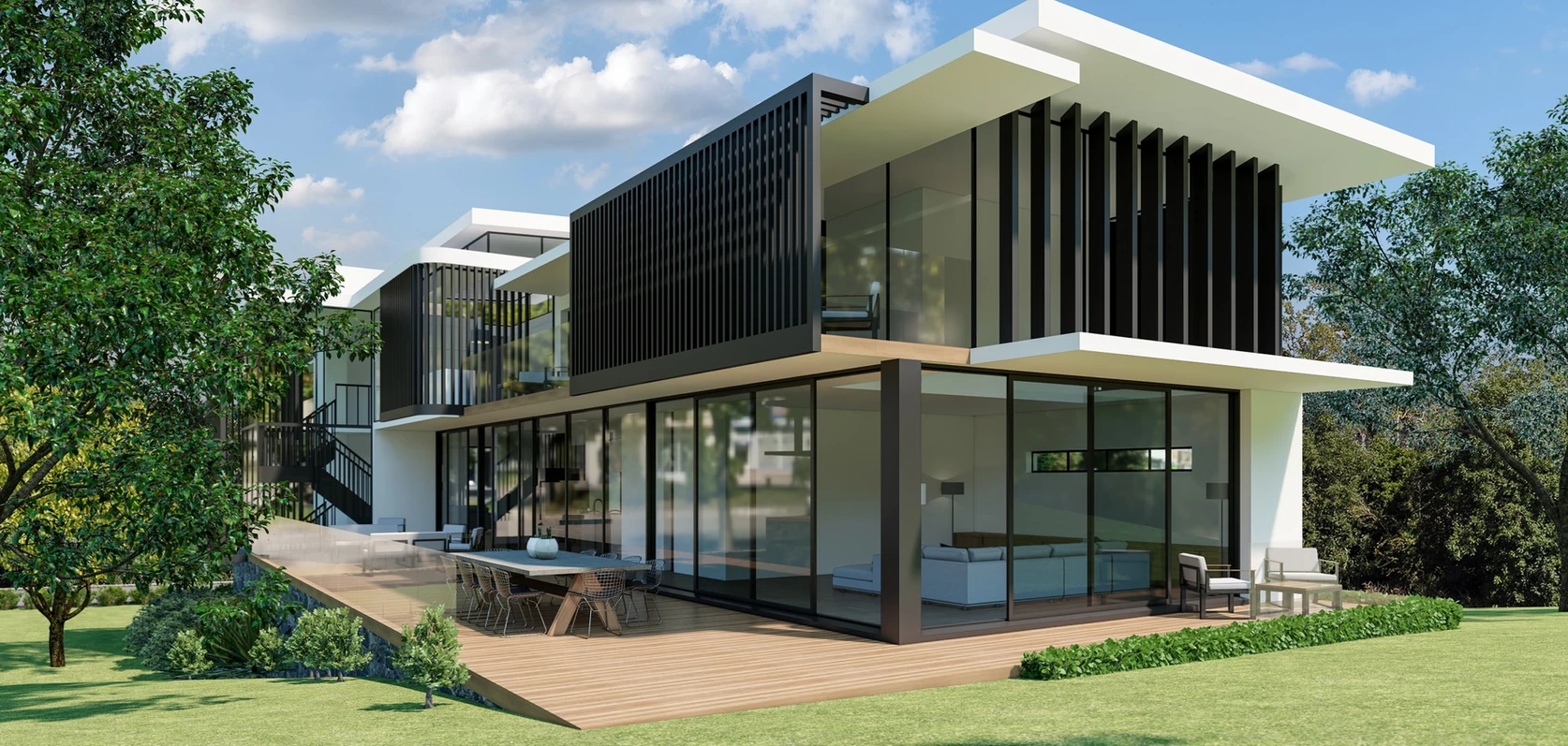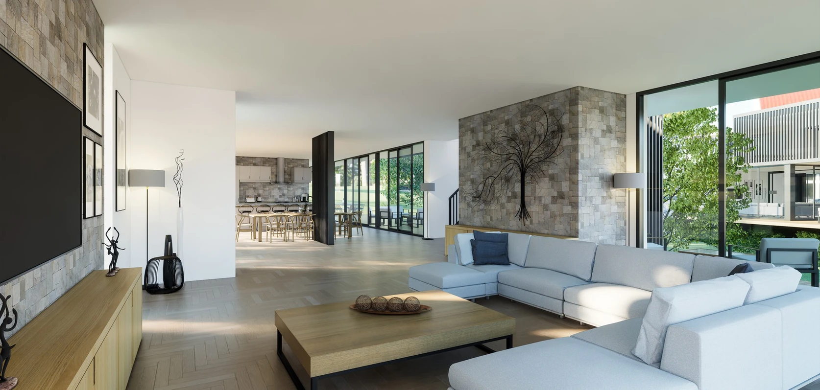 Design a family estate that balances independence and togetherness, with each family unit enjoying its own private home while sharing the larger property. Create spaces that celebrate family life, where multiple generations can live harmoniously while making the most of the stunning natural surroundings.